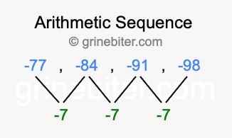 So, what type of sequence is -77, -84, -91, -98? The sequence -77, -84, -91, -98 has a common difference of -7 between each term. We call this kind of sequence an arithmetic sequence. Below is an image illustrating the correlation between the arithmetic sequence -77, -84, -91, -98 and its common difference of -7.