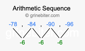 So, what type of sequence is -78, -84, -90, -96? The sequence -78, -84, -90, -96 has a common difference of -6 between each term. We call this kind of sequence an arithmetic sequence. Below is an image illustrating the correlation between the arithmetic sequence -78, -84, -90, -96 and its common difference of -6.