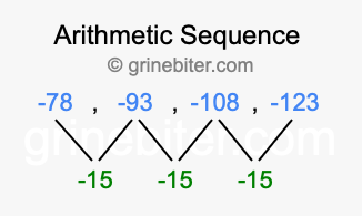 So, what type of sequence is -78, -93, -108, -123? The sequence -78, -93, -108, -123 has a common difference of -15 between each term. We call this kind of sequence an arithmetic sequence. Below is an image illustrating the correlation between the arithmetic sequence -78, -93, -108, -123 and its common difference of -15.