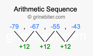 So, what type of sequence is -79, -67, -55, -43? The sequence -79, -67, -55, -43 has a common difference of +12 between each term. We call this kind of sequence an arithmetic sequence. Below is an image illustrating the correlation between the arithmetic sequence -79, -67, -55, -43 and its common difference of +12.