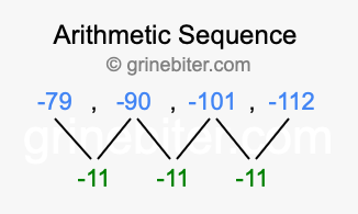 So, what type of sequence is -79, -90, -101, -112? The sequence -79, -90, -101, -112 has a common difference of -11 between each term. We call this kind of sequence an arithmetic sequence. Below is an image illustrating the correlation between the arithmetic sequence -79, -90, -101, -112 and its common difference of -11.