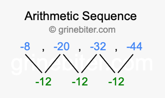So, what type of sequence is -8, -20, -32, -44? The sequence -8, -20, -32, -44 has a common difference of -12 between each term. We call this kind of sequence an arithmetic sequence. Below is an image illustrating the correlation between the arithmetic sequence -8, -20, -32, -44 and its common difference of -12.