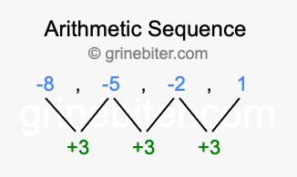 So, what type of sequence is -8, -5, -2, 1? The sequence -8, -5, -2, 1 has a common difference of +3 between each term. We call this kind of sequence an arithmetic sequence. Below is an image illustrating the correlation between the arithmetic sequence -8, -5, -2, 1 and its common difference of +3.