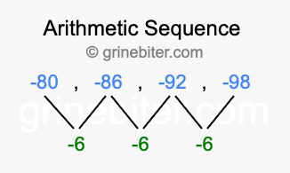 So, what type of sequence is -80, -86, -92, -98? The sequence -80, -86, -92, -98 has a common difference of -6 between each term. We call this kind of sequence an arithmetic sequence. Below is an image illustrating the correlation between the arithmetic sequence -80, -86, -92, -98 and its common difference of -6.