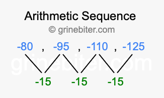 So, what type of sequence is -80, -95, -110, -125? The sequence -80, -95, -110, -125 has a common difference of -15 between each term. We call this kind of sequence an arithmetic sequence. Below is an image illustrating the correlation between the arithmetic sequence -80, -95, -110, -125 and its common difference of -15.
