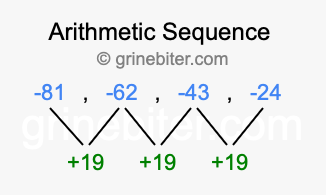So, what type of sequence is -81, -62, -43, -24? The sequence -81, -62, -43, -24 has a common difference of +19 between each term. We call this kind of sequence an arithmetic sequence. Below is an image illustrating the correlation between the arithmetic sequence -81, -62, -43, -24 and its common difference of +19.