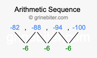 So, what type of sequence is -82, -88, -94, -100? The sequence -82, -88, -94, -100 has a common difference of -6 between each term. We call this kind of sequence an arithmetic sequence. Below is an image illustrating the correlation between the arithmetic sequence -82, -88, -94, -100 and its common difference of -6.