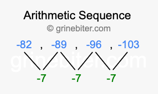 So, what type of sequence is -82, -89, -96, -103? The sequence -82, -89, -96, -103 has a common difference of -7 between each term. We call this kind of sequence an arithmetic sequence. Below is an image illustrating the correlation between the arithmetic sequence -82, -89, -96, -103 and its common difference of -7.