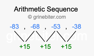 So, what type of sequence is -83, -68, -53, -38? The sequence -83, -68, -53, -38 has a common difference of +15 between each term. We call this kind of sequence an arithmetic sequence. Below is an image illustrating the correlation between the arithmetic sequence -83, -68, -53, -38 and its common difference of +15.