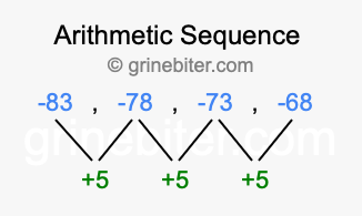 So, what type of sequence is -83, -78, -73, -68? The sequence -83, -78, -73, -68 has a common difference of +5 between each term. We call this kind of sequence an arithmetic sequence. Below is an image illustrating the correlation between the arithmetic sequence -83, -78, -73, -68 and its common difference of +5.