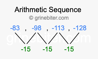 So, what type of sequence is -83, -98, -113, -128? The sequence -83, -98, -113, -128 has a common difference of -15 between each term. We call this kind of sequence an arithmetic sequence. Below is an image illustrating the correlation between the arithmetic sequence -83, -98, -113, -128 and its common difference of -15.