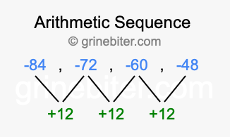 So, what type of sequence is -84, -72, -60, -48? The sequence -84, -72, -60, -48 has a common difference of +12 between each term. We call this kind of sequence an arithmetic sequence. Below is an image illustrating the correlation between the arithmetic sequence -84, -72, -60, -48 and its common difference of +12.