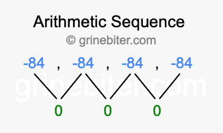 As stated above, the common difference (d) between each term is 0. Furthermore, the next term in -84, -84, -84, -84 is the fifth term (5), and the first term is -84. When we enter these values into our formula, we get the following answer: