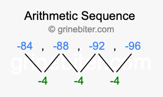 So, what type of sequence is -84, -88, -92, -96? The sequence -84, -88, -92, -96 has a common difference of -4 between each term. We call this kind of sequence an arithmetic sequence. Below is an image illustrating the correlation between the arithmetic sequence -84, -88, -92, -96 and its common difference of -4.