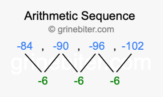 So, what type of sequence is -84, -90, -96, -102? The sequence -84, -90, -96, -102 has a common difference of -6 between each term. We call this kind of sequence an arithmetic sequence. Below is an image illustrating the correlation between the arithmetic sequence -84, -90, -96, -102 and its common difference of -6.