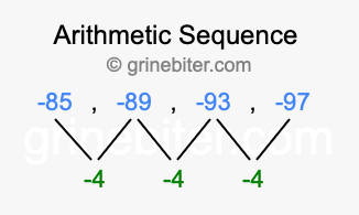 So, what type of sequence is -85, -89, -93, -97? The sequence -85, -89, -93, -97 has a common difference of -4 between each term. We call this kind of sequence an arithmetic sequence. Below is an image illustrating the correlation between the arithmetic sequence -85, -89, -93, -97 and its common difference of -4.