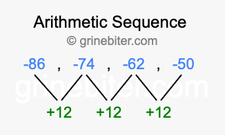 So, what type of sequence is -86, -74, -62, -50? The sequence -86, -74, -62, -50 has a common difference of +12 between each term. We call this kind of sequence an arithmetic sequence. Below is an image illustrating the correlation between the arithmetic sequence -86, -74, -62, -50 and its common difference of +12.
