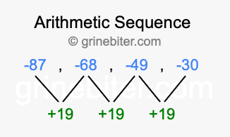 So, what type of sequence is -87, -68, -49, -30? The sequence -87, -68, -49, -30 has a common difference of +19 between each term. We call this kind of sequence an arithmetic sequence. Below is an image illustrating the correlation between the arithmetic sequence -87, -68, -49, -30 and its common difference of +19.