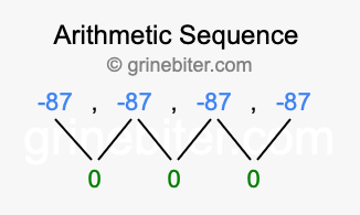 As stated above, the common difference (d) between each term is 0. Furthermore, the next term in -87, -87, -87, -87 is the fifth term (5), and the first term is -87. When we enter these values into our formula, we get the following answer: