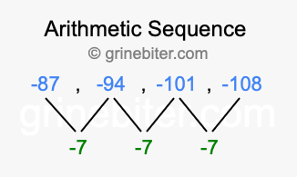 So, what type of sequence is -87, -94, -101, -108? The sequence -87, -94, -101, -108 has a common difference of -7 between each term. We call this kind of sequence an arithmetic sequence. Below is an image illustrating the correlation between the arithmetic sequence -87, -94, -101, -108 and its common difference of -7.