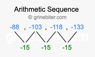 So, what type of sequence is -88, -103, -118, -133? The sequence -88, -103, -118, -133 has a common difference of -15 between each term. We call this kind of sequence an arithmetic sequence. Below is an image illustrating the correlation between the arithmetic sequence -88, -103, -118, -133 and its common difference of -15.