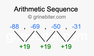 So, what type of sequence is -88, -69, -50, -31? The sequence -88, -69, -50, -31 has a common difference of +19 between each term. We call this kind of sequence an arithmetic sequence. Below is an image illustrating the correlation between the arithmetic sequence -88, -69, -50, -31 and its common difference of +19.