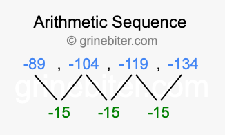 So, what type of sequence is -89, -104, -119, -134? The sequence -89, -104, -119, -134 has a common difference of -15 between each term. We call this kind of sequence an arithmetic sequence. Below is an image illustrating the correlation between the arithmetic sequence -89, -104, -119, -134 and its common difference of -15.