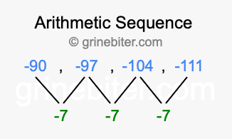 So, what type of sequence is -90, -97, -104, -111? The sequence -90, -97, -104, -111 has a common difference of -7 between each term. We call this kind of sequence an arithmetic sequence. Below is an image illustrating the correlation between the arithmetic sequence -90, -97, -104, -111 and its common difference of -7.