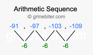 So, what type of sequence is -91, -97, -103, -109? The sequence -91, -97, -103, -109 has a common difference of -6 between each term. We call this kind of sequence an arithmetic sequence. Below is an image illustrating the correlation between the arithmetic sequence -91, -97, -103, -109 and its common difference of -6.