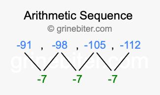 So, what type of sequence is -91, -98, -105, -112? The sequence -91, -98, -105, -112 has a common difference of -7 between each term. We call this kind of sequence an arithmetic sequence. Below is an image illustrating the correlation between the arithmetic sequence -91, -98, -105, -112 and its common difference of -7.