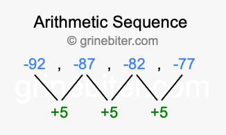 So, what type of sequence is -92, -87, -82, -77? The sequence -92, -87, -82, -77 has a common difference of +5 between each term. We call this kind of sequence an arithmetic sequence. Below is an image illustrating the correlation between the arithmetic sequence -92, -87, -82, -77 and its common difference of +5.