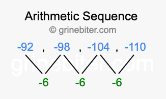 So, what type of sequence is -92, -98, -104, -110? The sequence -92, -98, -104, -110 has a common difference of -6 between each term. We call this kind of sequence an arithmetic sequence. Below is an image illustrating the correlation between the arithmetic sequence -92, -98, -104, -110 and its common difference of -6.