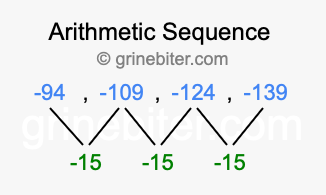 So, what type of sequence is -94, -109, -124, -139? The sequence -94, -109, -124, -139 has a common difference of -15 between each term. We call this kind of sequence an arithmetic sequence. Below is an image illustrating the correlation between the arithmetic sequence -94, -109, -124, -139 and its common difference of -15.