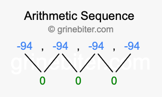 So, what type of sequence is -94, -94, -94, -94? The sequence -94, -94, -94, -94 has a common difference of 0 between each term. We call this kind of sequence an arithmetic sequence. Below is an image illustrating the correlation between the arithmetic sequence -94, -94, -94, -94 and its common difference of 0.