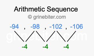 So, what type of sequence is -94, -98, -102, -106? The sequence -94, -98, -102, -106 has a common difference of -4 between each term. We call this kind of sequence an arithmetic sequence. Below is an image illustrating the correlation between the arithmetic sequence -94, -98, -102, -106 and its common difference of -4.