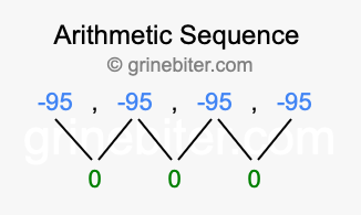 So, what type of sequence is -95, -95, -95, -95? The sequence -95, -95, -95, -95 has a common difference of 0 between each term. We call this kind of sequence an arithmetic sequence. Below is an image illustrating the correlation between the arithmetic sequence -95, -95, -95, -95 and its common difference of 0.