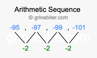 So, what type of sequence is -95, -97, -99, -101? The sequence -95, -97, -99, -101 has a common difference of -2 between each term. We call this kind of sequence an arithmetic sequence. Below is an image illustrating the correlation between the arithmetic sequence -95, -97, -99, -101 and its common difference of -2.