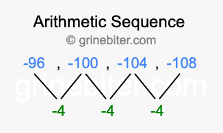 So, what type of sequence is -96, -100, -104, -108? The sequence -96, -100, -104, -108 has a common difference of -4 between each term. We call this kind of sequence an arithmetic sequence. Below is an image illustrating the correlation between the arithmetic sequence -96, -100, -104, -108 and its common difference of -4.