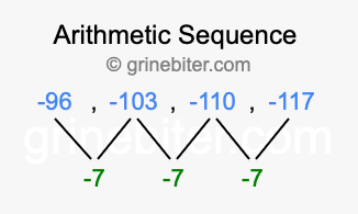 So, what type of sequence is -96, -103, -110, -117? The sequence -96, -103, -110, -117 has a common difference of -7 between each term. We call this kind of sequence an arithmetic sequence. Below is an image illustrating the correlation between the arithmetic sequence -96, -103, -110, -117 and its common difference of -7.