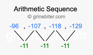 So, what type of sequence is -96, -107, -118, -129? The sequence -96, -107, -118, -129 has a common difference of -11 between each term. We call this kind of sequence an arithmetic sequence. Below is an image illustrating the correlation between the arithmetic sequence -96, -107, -118, -129 and its common difference of -11.