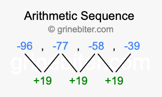 So, what type of sequence is -96, -77, -58, -39? The sequence -96, -77, -58, -39 has a common difference of +19 between each term. We call this kind of sequence an arithmetic sequence. Below is an image illustrating the correlation between the arithmetic sequence -96, -77, -58, -39 and its common difference of +19.
