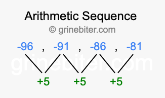 So, what type of sequence is -96, -91, -86, -81? The sequence -96, -91, -86, -81 has a common difference of +5 between each term. We call this kind of sequence an arithmetic sequence. Below is an image illustrating the correlation between the arithmetic sequence -96, -91, -86, -81 and its common difference of +5.