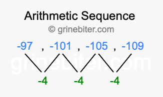 So, what type of sequence is -97, -101, -105, -109? The sequence -97, -101, -105, -109 has a common difference of -4 between each term. We call this kind of sequence an arithmetic sequence. Below is an image illustrating the correlation between the arithmetic sequence -97, -101, -105, -109 and its common difference of -4.