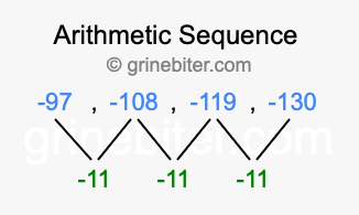 So, what type of sequence is -97, -108, -119, -130? The sequence -97, -108, -119, -130 has a common difference of -11 between each term. We call this kind of sequence an arithmetic sequence. Below is an image illustrating the correlation between the arithmetic sequence -97, -108, -119, -130 and its common difference of -11.