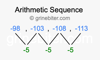 So, what type of sequence is -98, -103, -108, -113? The sequence -98, -103, -108, -113 has a common difference of -5 between each term. We call this kind of sequence an arithmetic sequence. Below is an image illustrating the correlation between the arithmetic sequence -98, -103, -108, -113 and its common difference of -5.