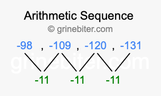 So, what type of sequence is -98, -109, -120, -131? The sequence -98, -109, -120, -131 has a common difference of -11 between each term. We call this kind of sequence an arithmetic sequence. Below is an image illustrating the correlation between the arithmetic sequence -98, -109, -120, -131 and its common difference of -11.
