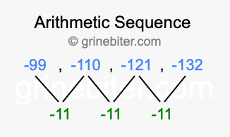So, what type of sequence is -99, -110, -121, -132? The sequence -99, -110, -121, -132 has a common difference of -11 between each term. We call this kind of sequence an arithmetic sequence. Below is an image illustrating the correlation between the arithmetic sequence -99, -110, -121, -132 and its common difference of -11.