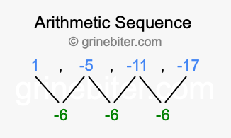 So, what type of sequence is 1, -5, -11, -17? The sequence 1, -5, -11, -17 has a common difference of -6 between each term. We call this kind of sequence an arithmetic sequence. Below is an image illustrating the correlation between the arithmetic sequence 1, -5, -11, -17 and its common difference of -6.