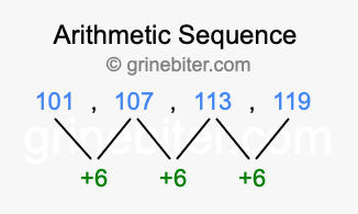 So, what type of sequence is 101, 107, 113, 119? The sequence 101, 107, 113, 119 has a common difference of +6 between each term. We call this kind of sequence an arithmetic sequence. Below is an image illustrating the correlation between the arithmetic sequence 101, 107, 113, 119 and its common difference of +6.