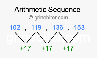 So, what type of sequence is 102, 119, 136, 153? The sequence 102, 119, 136, 153 has a common difference of +17 between each term. We call this kind of sequence an arithmetic sequence. Below is an image illustrating the correlation between the arithmetic sequence 102, 119, 136, 153 and its common difference of +17.